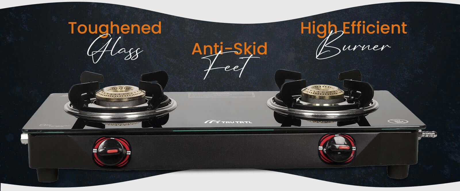 The truTRTL 2 Burner Gas Stove features a toughened 6mm black glass top for a premium look and rust resistance. It has two fuel-efficient tri-pin burners (small and large), ensuring optimal cooking flexibility. The stove is designed with high-quality Bakelite knobs and anti-skid rubber legs for safe and effortless operation.